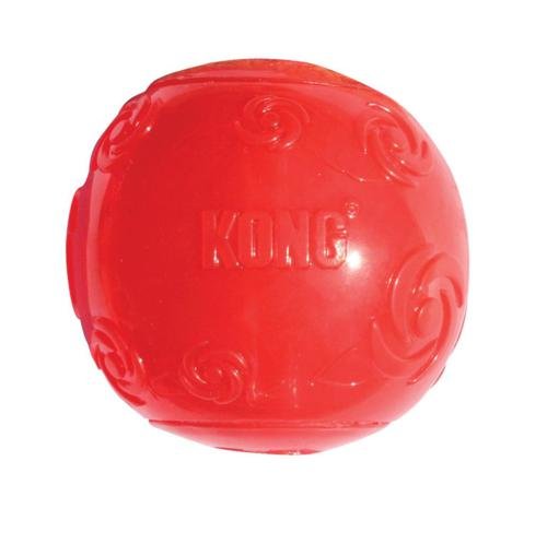 KONG Squeezz Dog Toy is perfect for toss and fetch games. This dog toy has a silly erratic bounce when thrown so every time you throw it your dog can have fun chasing it in a different direction. The squeaker is recessed for protection so your dog can enjoy the surprise squeak for a very long time when she or he bites this dog toy. The raised surfaces in this great dog toy make it easy to keep a grip throughout game time. This dog toy is created from a durable, non-toxic thermo plastic rubber for plenty of hours of protected play.