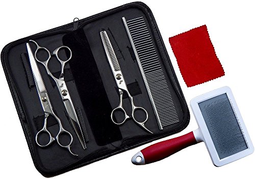 Regular grooming trips to the vet are money and time consuming, not to mention anxiety-filled. Whether you need to skip the grooming trips entirely or try to keep the coat clean and comb out any mats or tangles on your pet’s coat between the grooming trips, the PET SMILES Home Grooming Kit is a handy gizmo that offers you some peace of mind by caring for grooming at home, by someone your pet trusts. This kit is a bundle of an ergonomically-designed and lightweight Slicker Brush and a set of 3 razor sharp, heavy duty Stainless Steel Scissors and a Comb in a sleek, black, leather-like Case that holds them nicely in place.