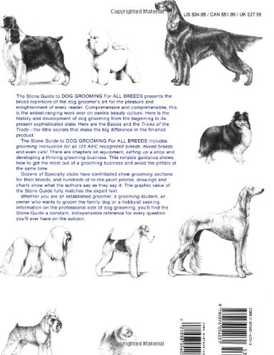 The Stone Guide to Dog Grooming For All Breeds includes grooming instruction for all 125 AKC recognized breeds, mixed breeds and even cats! There are chapters on equipment, putting in place a shop and developing a thriving grooming business. This reliable guidance shows the right way to get the most out of a grooming business and steer clear of the pitfalls at the same time. Dozens of Specialty clubs have contributed show grooming sections for their breeds, and hundreds of to-the-point photos, drawings and charts show what the authors say as they say it.