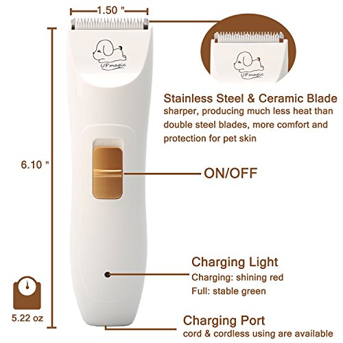 How to use the clipper more effectively? Before you run this clipper through your dogs hair, oil them and brush the dog out, remove any and all mats with a scissors as the matts will clog the clippers making it unimaginable to use them. And bathe your dog, never clip a dirty dog all the time washed, fully dried and free from any matts. Distinctive Features of UPmagic Pet Clipper Quiet working